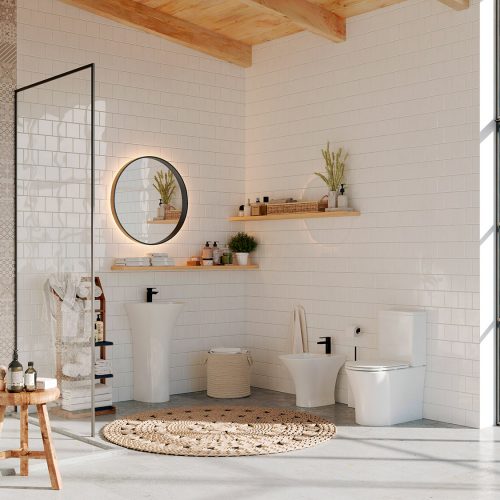 Pack inodoro cisterna baja. Incluye taza a suelo con salida dual (con tornillería), codo de conversión vertical, cisterna baja de alimentación base, mecanismo de alimentación base, tapa extra-plana con caída amortiguada (incluye herrajes). Ref 01017.