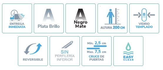 Mampara de ducha con perfilería en aluminio color negro mate. Su altura es de 200 centímetros y el vidrio templado de 8 milímetros.