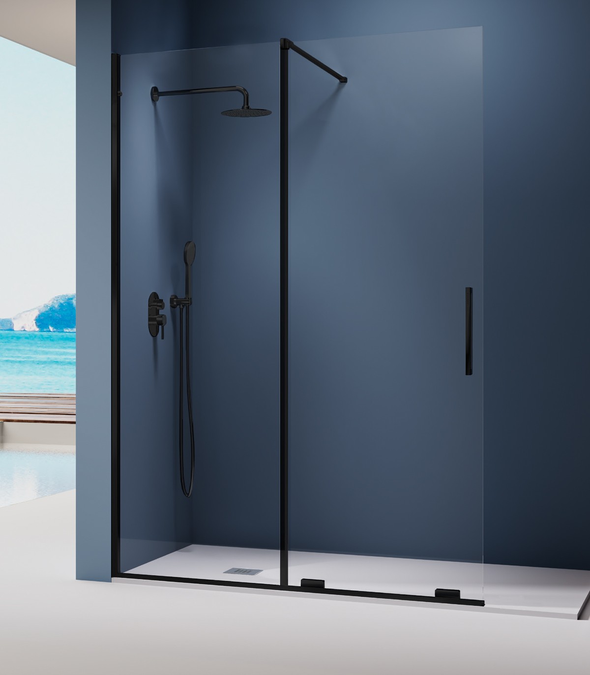 Moka Frente de Ducha Fijo + Puerta Corredera con Tirante Negro Mate