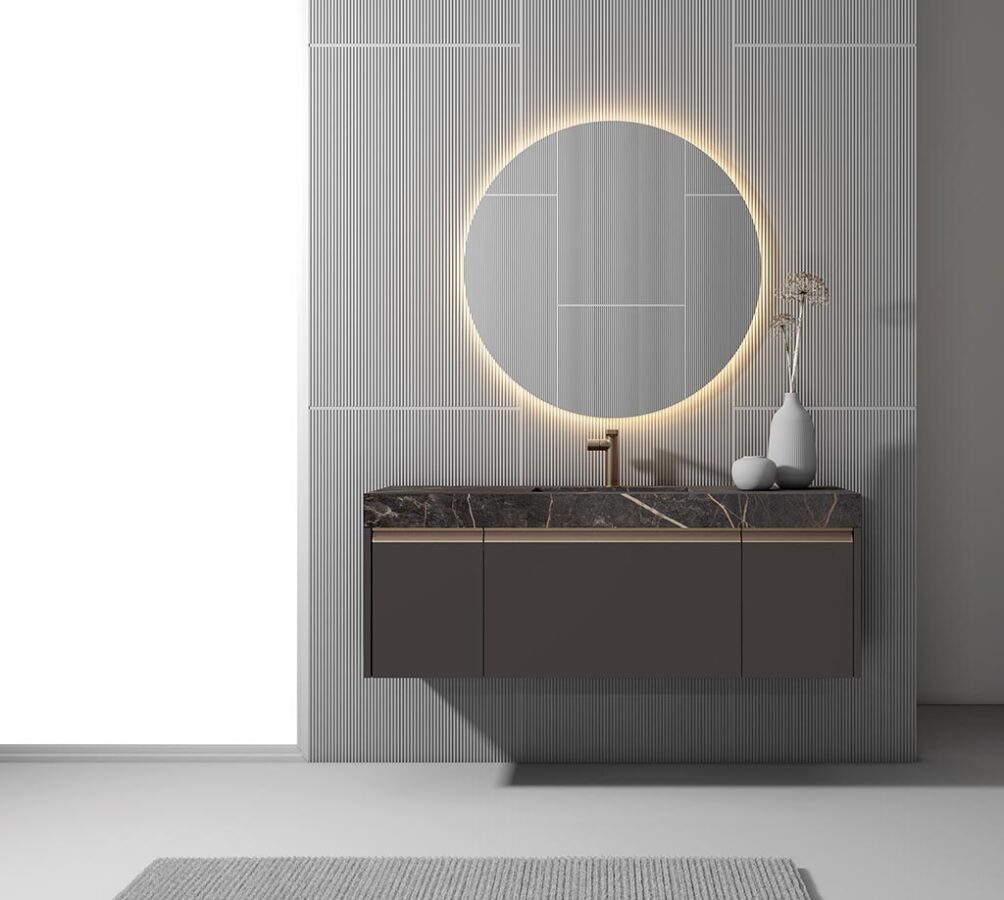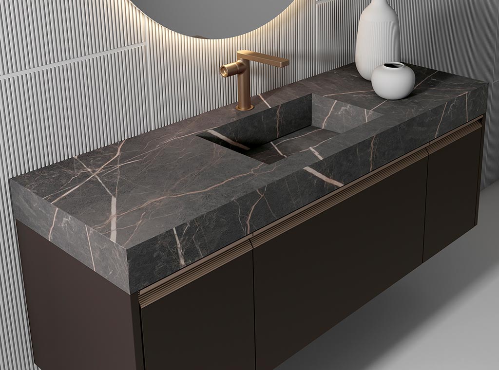 Encimera PIVSOLID con faldón de 10 cm en acabado Pearl Line y lavabo Olimpo centrado. Composición modular barras 2, en acabado Fénix Cacao Orinoco con tiradores Abby en bronce.
