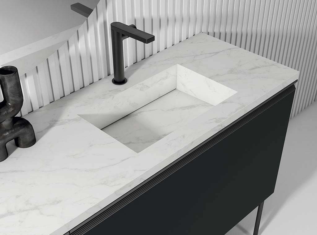 Encimera PIVSOLID acabado Mármol Zeus con lavabo Olimpo desplazado y faldón ingletado de altura 3 cm.