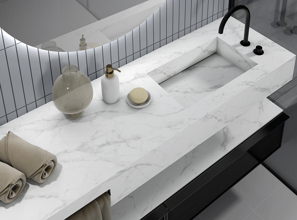 Encimera PIVSOLID, acabado Mármol Zeus, lavabo Olimpo con desagüe libre del mismo acabado y toallero mecanizado en el faldón frontal para mayor practicidad.