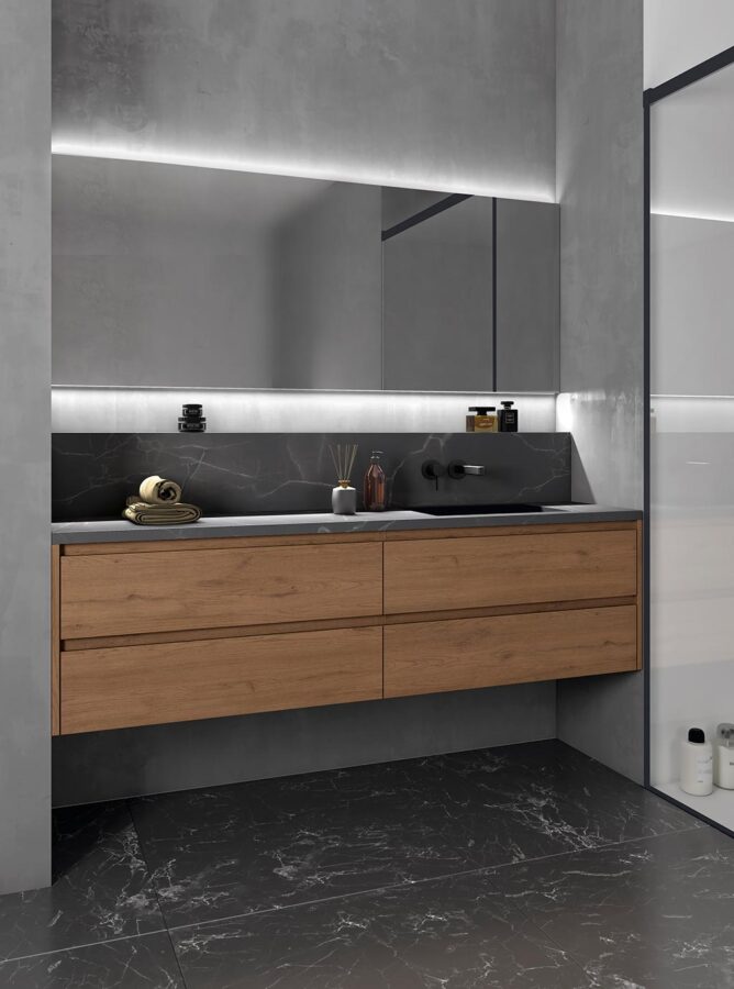 Encimera PIVSOLID, acabado Marquina Soft con lavabo Argo negro, copete grifería con funcionalidad de repisa, iluminada por la luz del propio espejo.