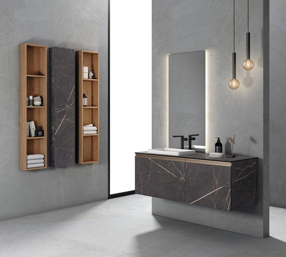 La combinación de encimera PIVSOLID en Pearl Line con el lavabo semiencastre Durian Roma 50 y mobiliario en HPL Pearl Line, junto con los tiradores Abby en bronce destaca por su estilo único.