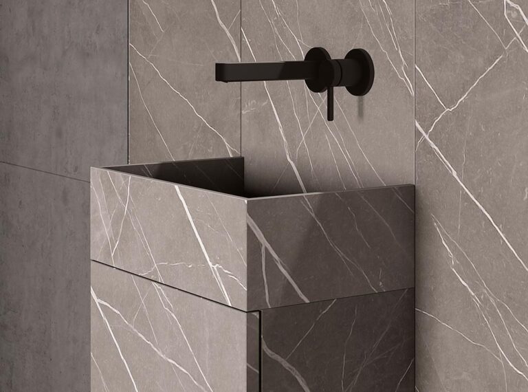 Lavabo PIVSOLID, Egeo Mural en acabado Pietra Grey con copete grifería integrado sobre bajo lavabo 2 cajones a suelo integrado en composición mural adaptada al espacio, módulos a suelo y repisas de apoyo para almacenaje de pequeños objetos de uso diario.