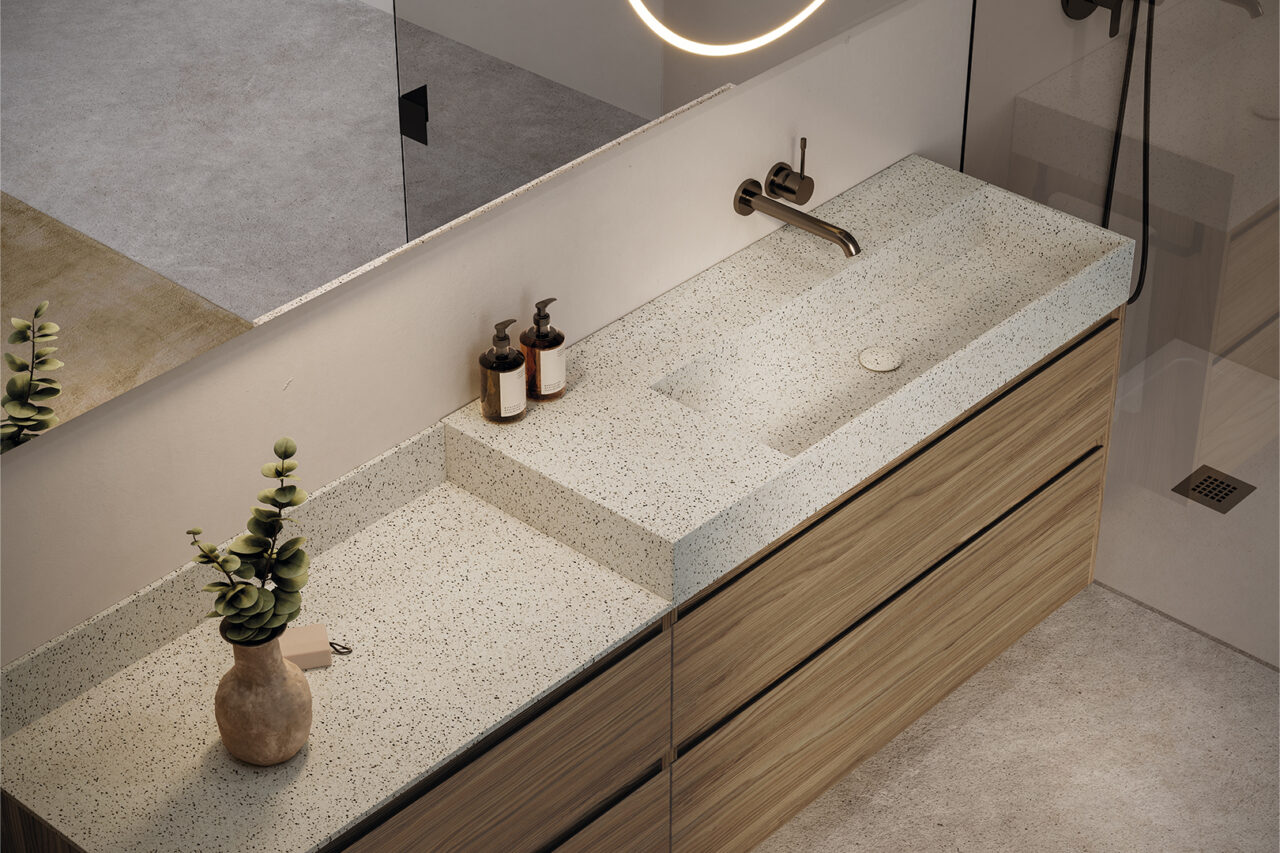 Encimeras doble altura, lavabo Bari en acabado Durian Duna.