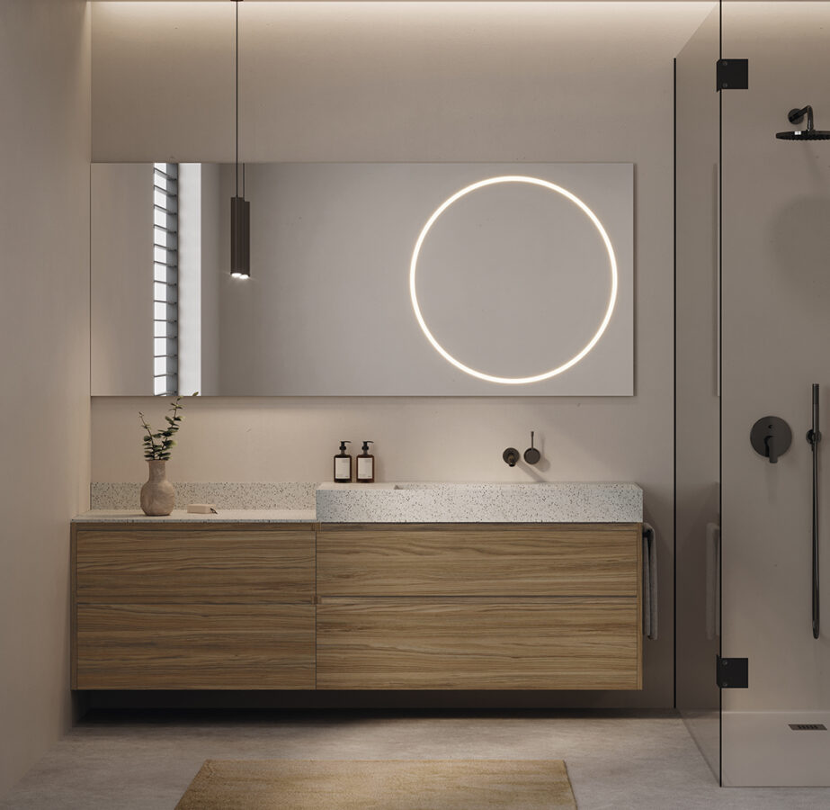 Espejo Halo, arenado circular centrado con el lavabo.