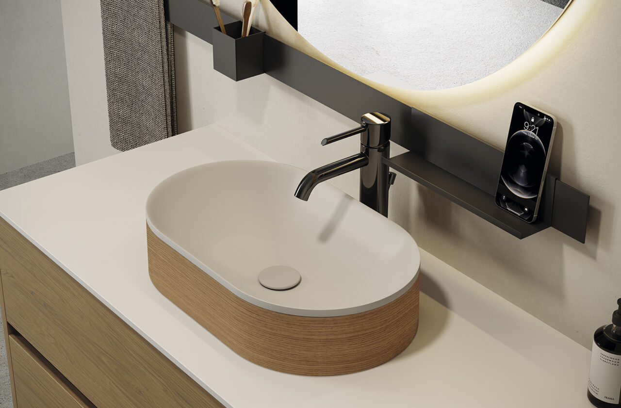 Encimera sin lavabo Durian blanco y lavabo Enna, diseño Eclipse, acabado Querkus Natural.