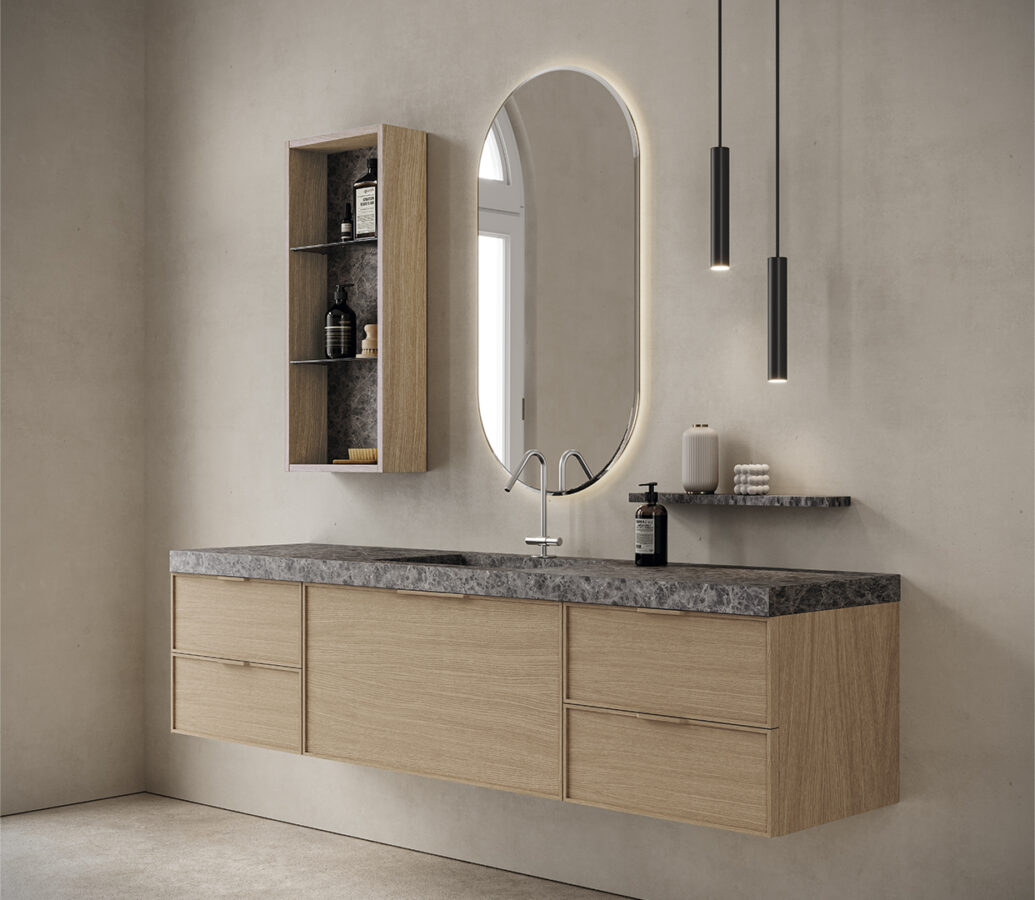 Repisa en acabado HPL Litho Light y lámparas Victoria negras.