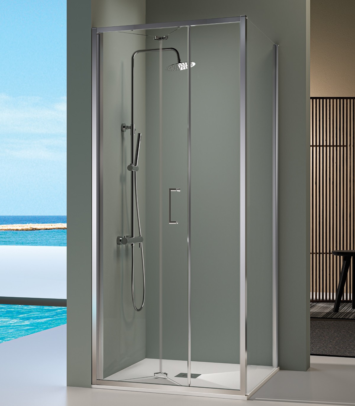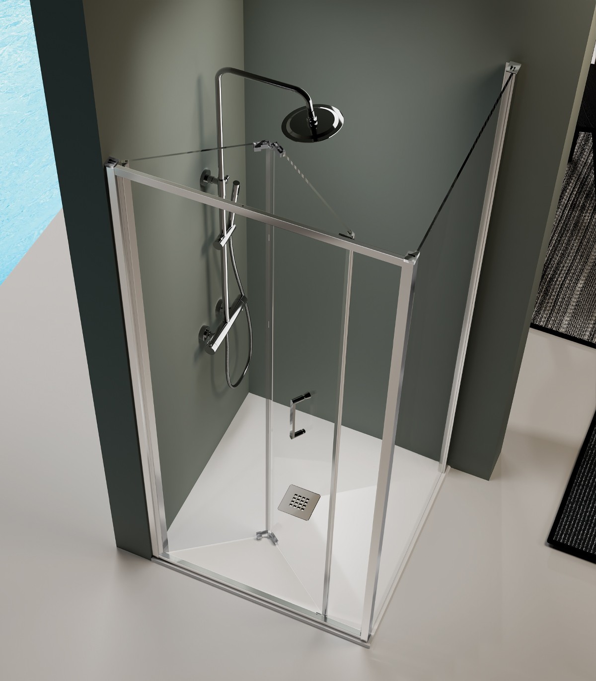 Mampara de ducha con perfilería en aluminio anodizado. Su altura es de 195 centímetros y el vidrio templado de 6 milímetros.