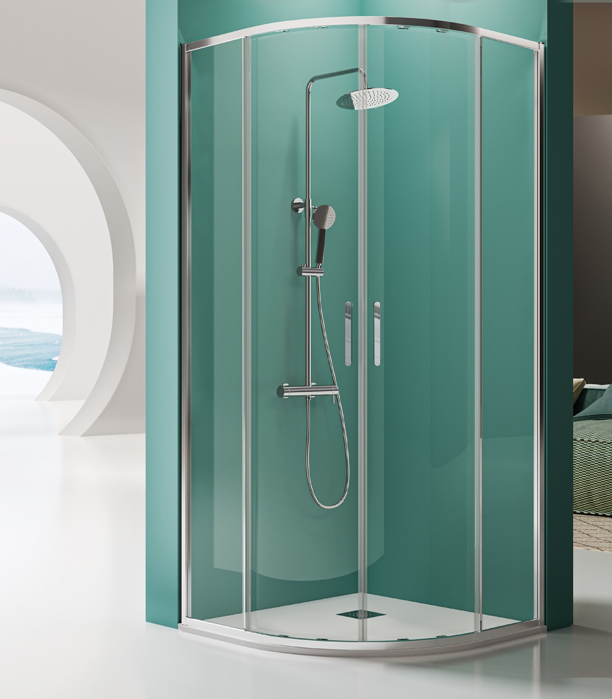 Mampara de ducha con perfilería en aluminio anodizado. Su altura es de 190 centímetros y el vidrio templado de 6 milímetros.