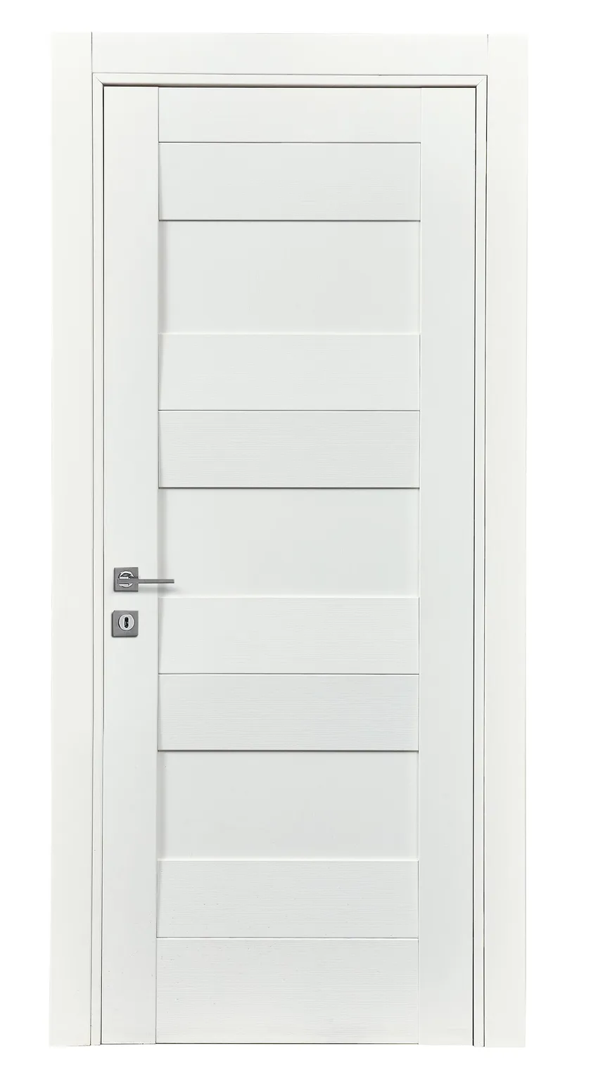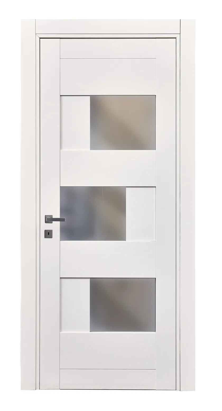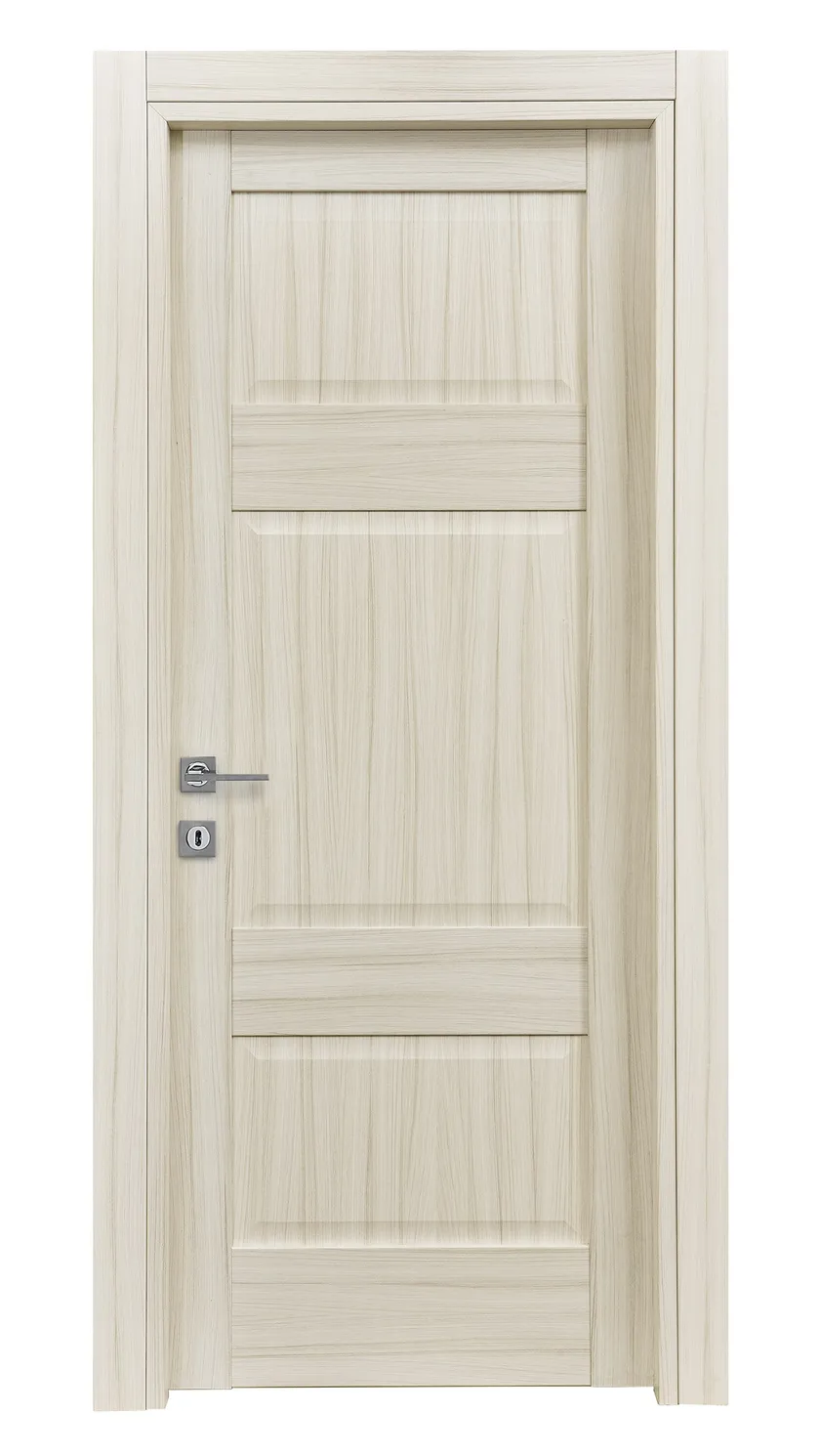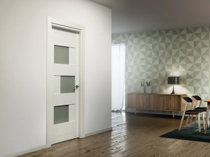 Puerta de perfil laminado panelado melamínico con hojas ciegas o acristaladas, con marco de blockboard y revestimiento multicapa, estructura de los perfiles de blockboard/MDF panelado melamínico. Cerradura magnética, doble vástago o bisagras ocultas regulables en 3 ejes.